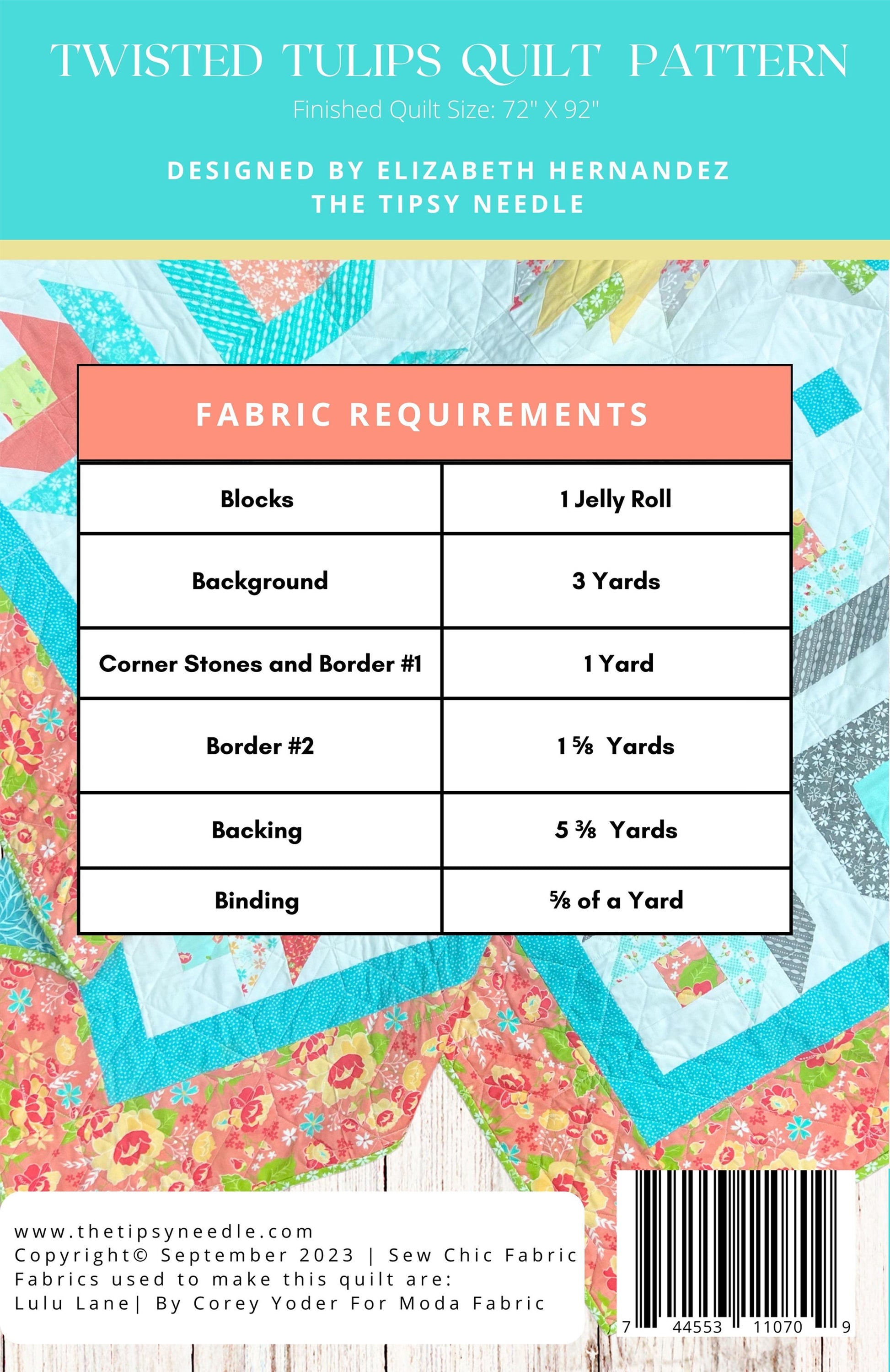 The Twisted Tulip Quilt Pattern by The Tipsy Needle is a modern, beginner-friendly design featuring playful tulip-inspired blocks created with easy strip piecing. It’s jelly roll–friendly and finishes at approximately 72" x 92", making it perfect for a large throw or bed quilt. The pattern includes clear instructions and is great for showcasing bright, scrappy fabrics.
